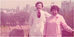Figura 2. El Dr. José Luis Cabouli con la enfermera-caba de la Sala 6, Sra. Chela Fanelli en la terraza del Pabellón 2 del Hospital Rawson, 1977. Nótense las tejas provenientes de Marsella, Francia.