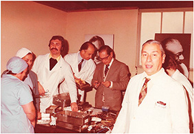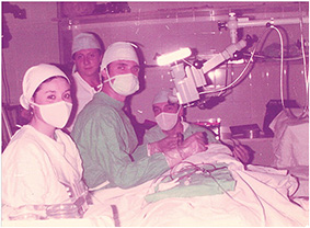 Figura 9. En el Hospital Ramos Mejía el Dr. José Luis Cabouli realiza una anastomosis microvascular con microscopio. Ayudante: Dr. Jorge Mascotto. Observador: (sin barbijo) Dr. Juan C. Sciorra, 1982.